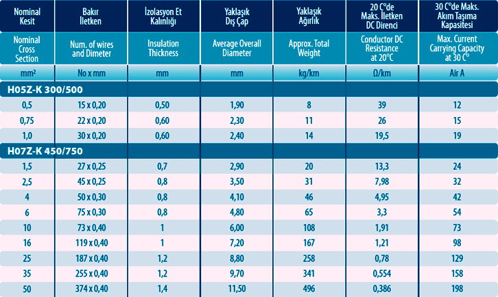 H05Z-K ve H07Z-K Kablo Tipleri: Hem "H05Z-K" hem de "H07Z-K" terimleri, halogen içermeyen (halogen-free) yalıtkan malzemelerle kaplanmış kablo tiplerini ifade eder. "H05Z-K" daha ince kesitli kablolar için kullanılırken, "H07Z-K" daha kalın kesitli kablolar için kullanılır.
